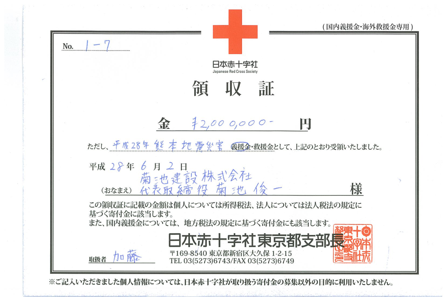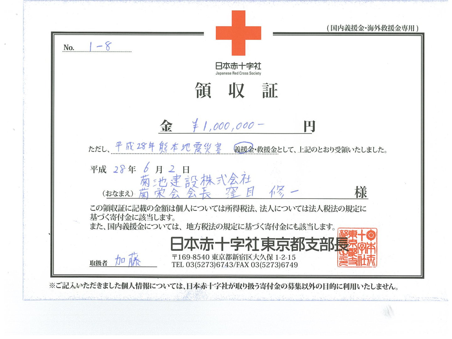 菊池建設では、この災害により被災された方々を支援するために義援金として菊池建設より200万円、菊栄会より100万円を西東京市を通じて寄付致しました。