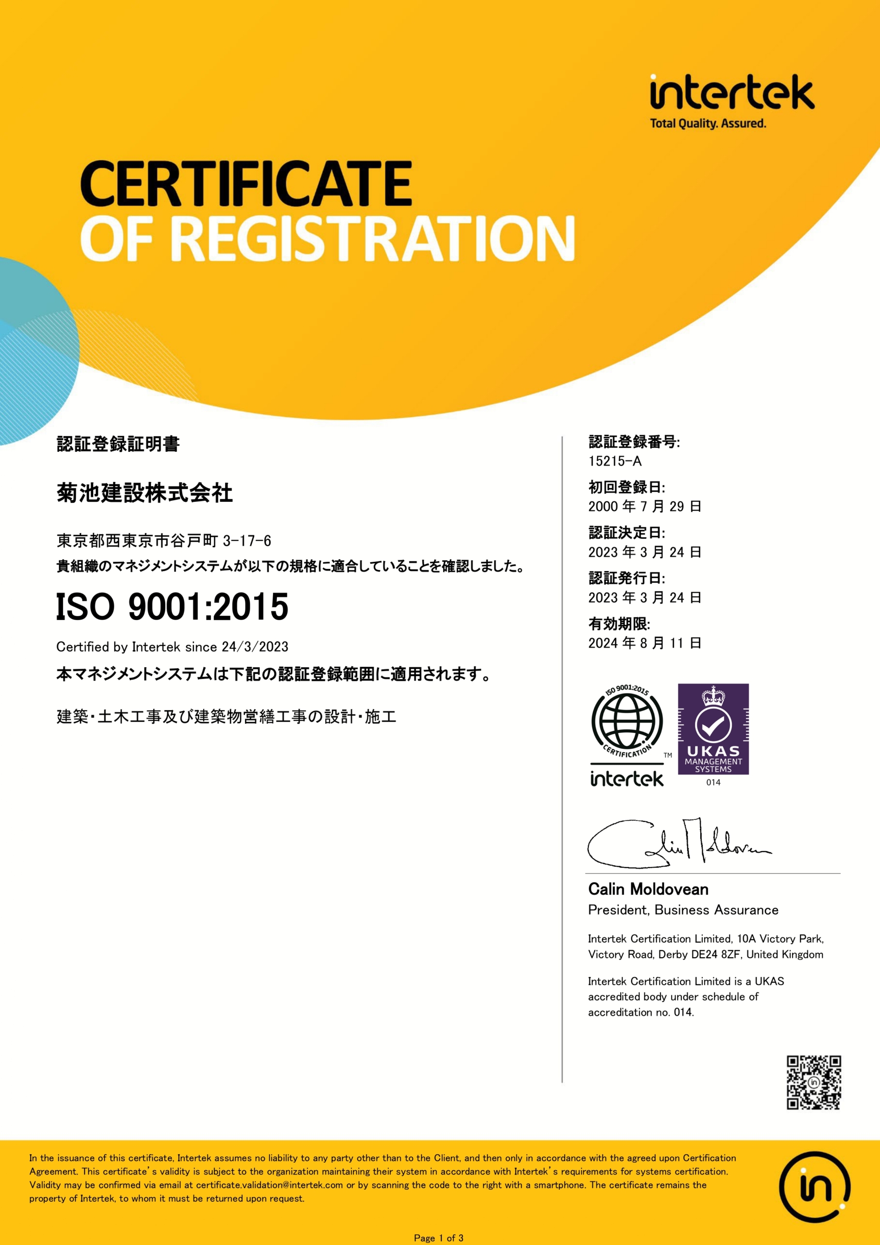 菊池建設は2000年7月、品質管理・保証システムの国際規格である「ISO9001」の認証を建設業界でいち早く取得し、2023年3月にISO14001:2015を認証取得いたしました。